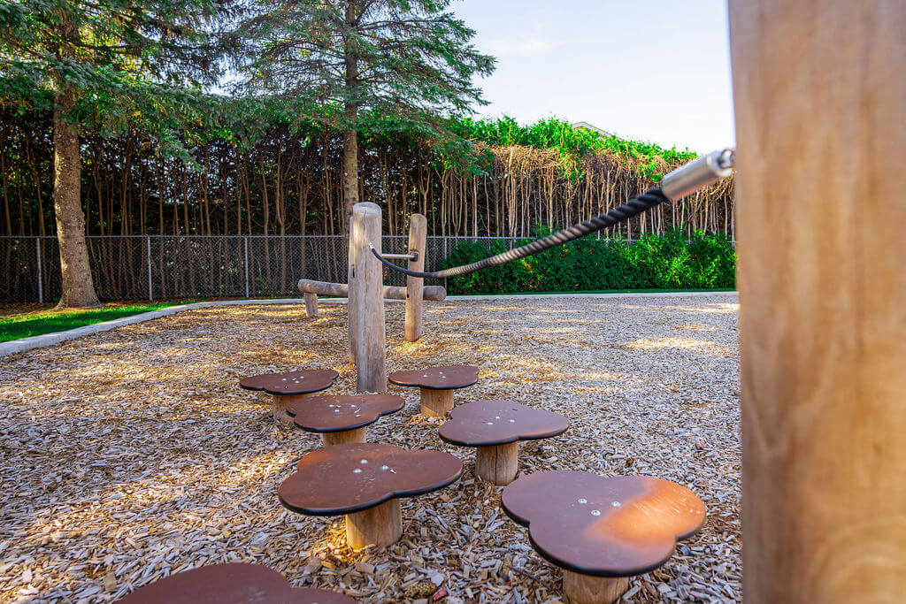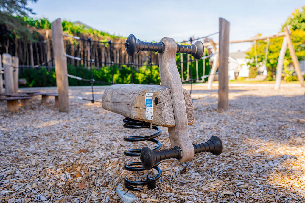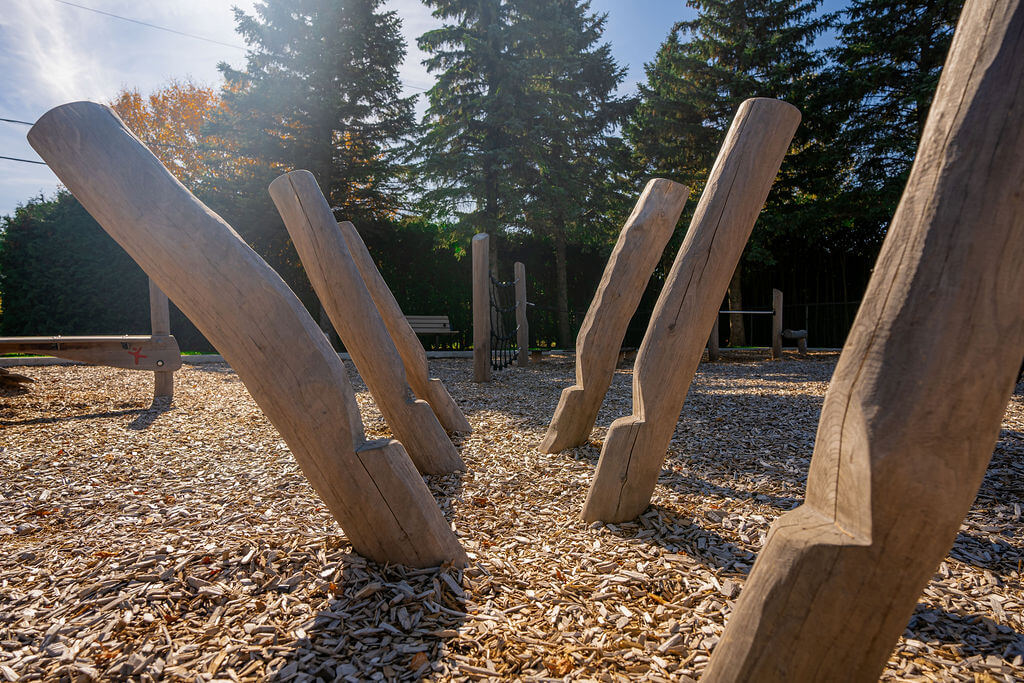 Autour, les Échasses Robinia invitent à l’agilité et à la concentration. Les enfants s’y lancent des défis, sautent d’un poteau à l’autre ou s’y posent pour discuter. Les balançoires, quant à elles, apportent une touche de liberté pure : celle de sentir le vent, de rire à deux ou de profiter du mouvement.