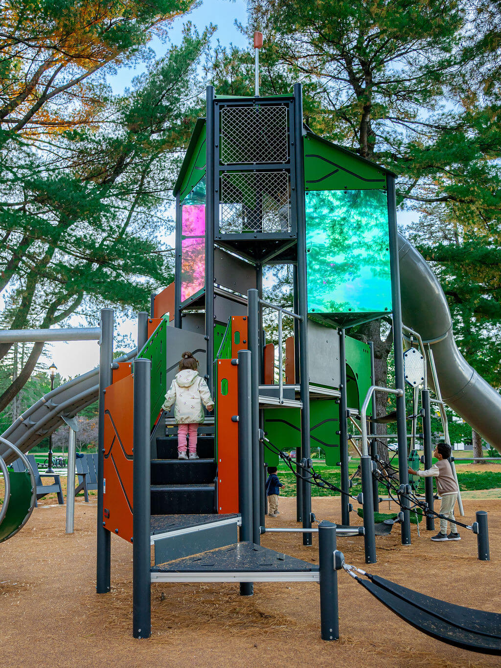 Le jeu combine défi physique et stimulation sensorielle, tout en s’intégrant naturellement dans le paysage arboré du parc. Il évoque la sensation de jouer dans les arbres qui l’entourent – une invitation à explorer et à s’élever.
